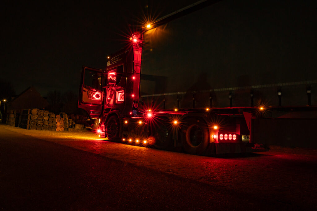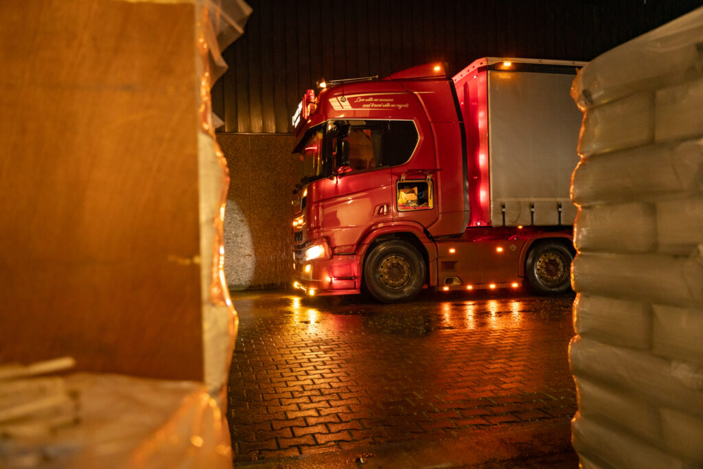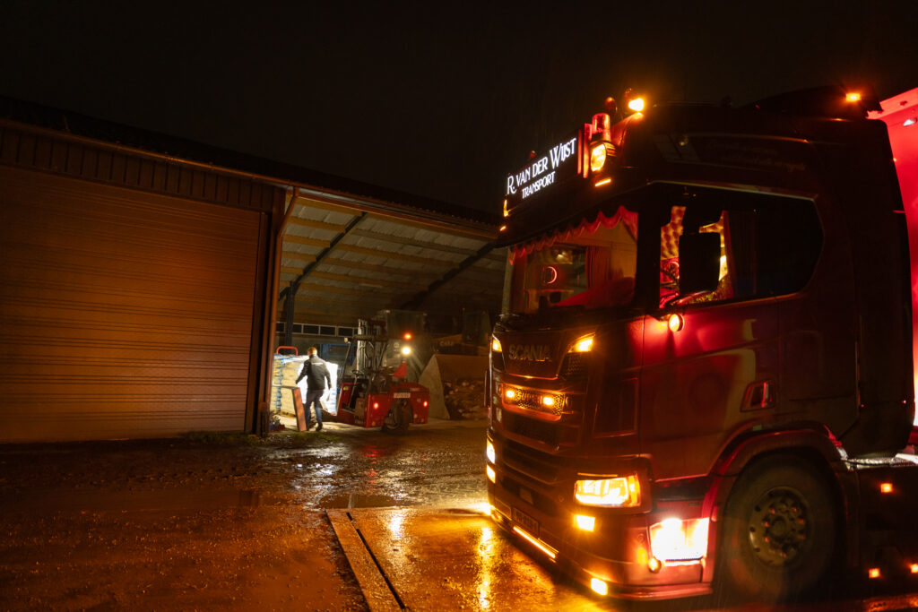 Na een volle dag rijden, laden, lossen en praten, keren we terug naar de standplaats. Thomas maakt zich klaar voor een meerdaagse rit naar België. We maken nog wat foto’s van de truck in het laatste licht. “Hard werken loont,” zegt hij met een glimlach. En dat zie je – in zijn toewijding, zijn rust achter het stuur en de staat van zijn Scania.