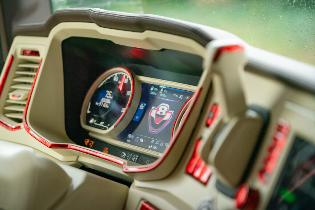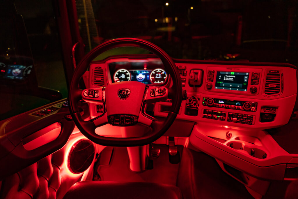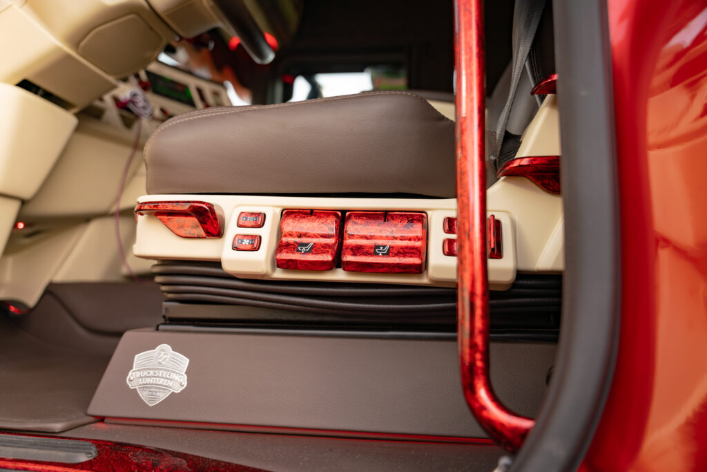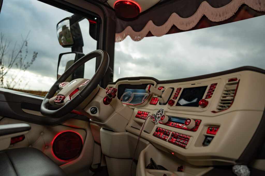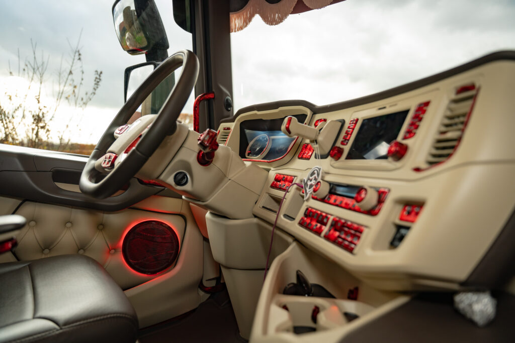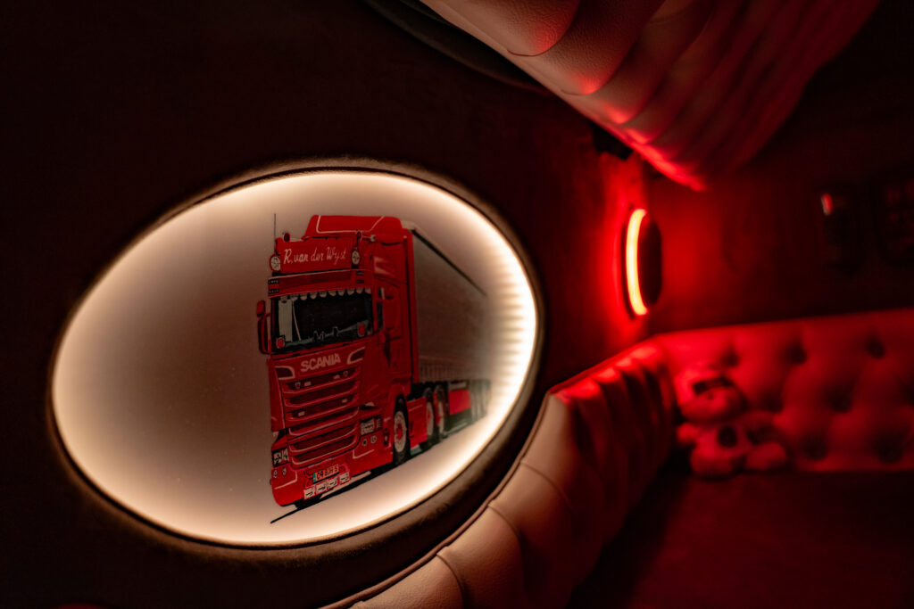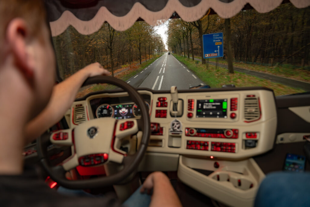 Om 5.00 uur begint de dag in Zeeland (NB). Het regent stevig, maar in de warme cabine met crème-grijs-rood interieur is het aangenaam. Thomas vertelt trots over de inrichting: “Het ontwerp is echt uniek. Alles afgestemd op de buitenkant van de truck. Dit zie je nergens anders.”