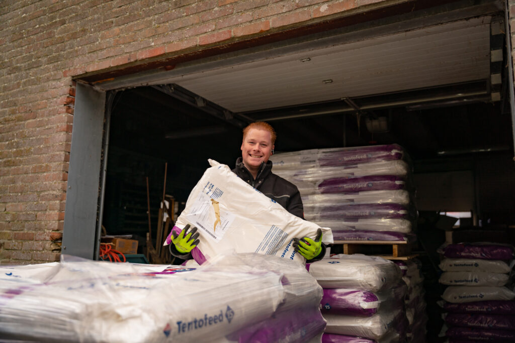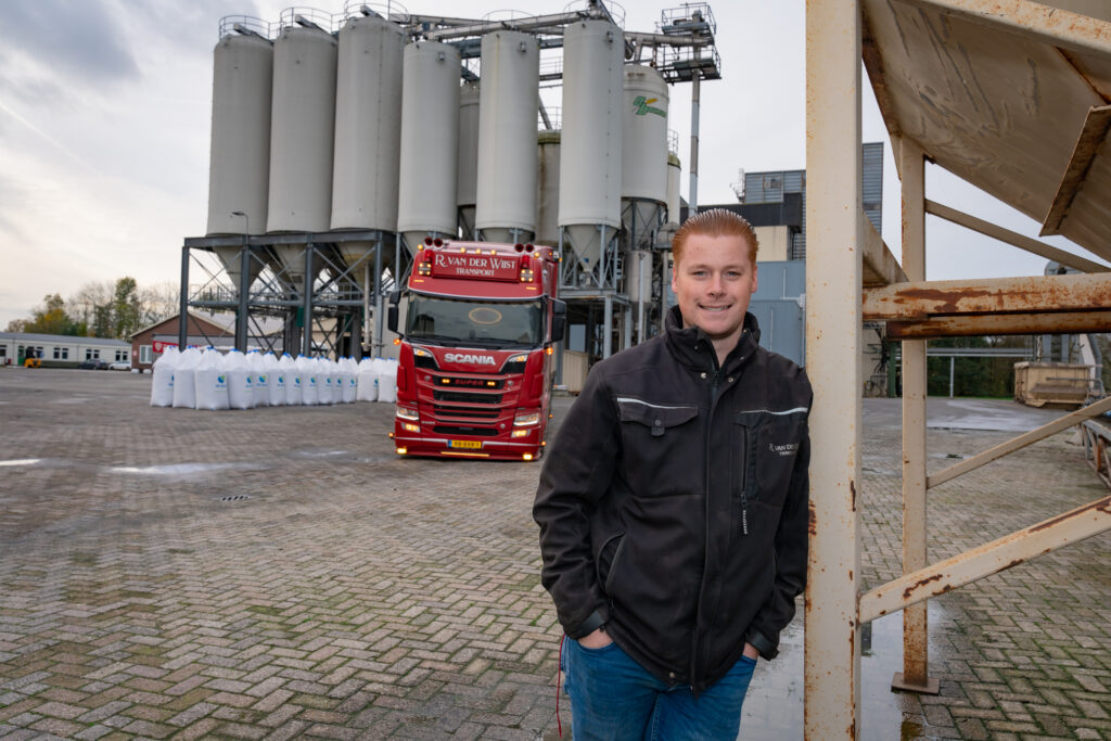 Zijn werk? Het vervoeren van zakgoed en bigbags naar boeren en agrarische bedrijven in Nederland, België en Duitsland. Geen schoon werk – zeker niet op een herfstige, natte dag als deze – maar het enthousiasme van Thomas spat er vanaf.