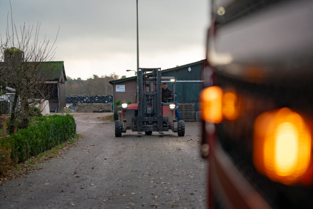 De eerste rit gaat verrassend genoeg naar een woonwijk, waar we pallets afleveren bij een vertegenwoordiger van een veevoerbedrijf. Daarna duiken we het boerenland in: smalle wegen, natte erven en diepe modderplassen. “Mijn truck is zelden schoon,” lacht Thomas. “Maar ik was hem elke week met de hand. Hoort erbij.”